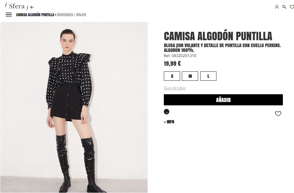 Es una de las grandes blusas preferidas de las mujeres, ya que cuenta con volantes y detalles de puntillas con cuello Perkins. Además, está fabricada con un material para ofrecer una frescura en todo momento, como es el caso del algodón. Esta se puede usar con una hermosa falda de la misma tienda para generar ese toque sexi. Si la desean comprar solo tienen que entrar a Sfera por un precio de 19,99 €.