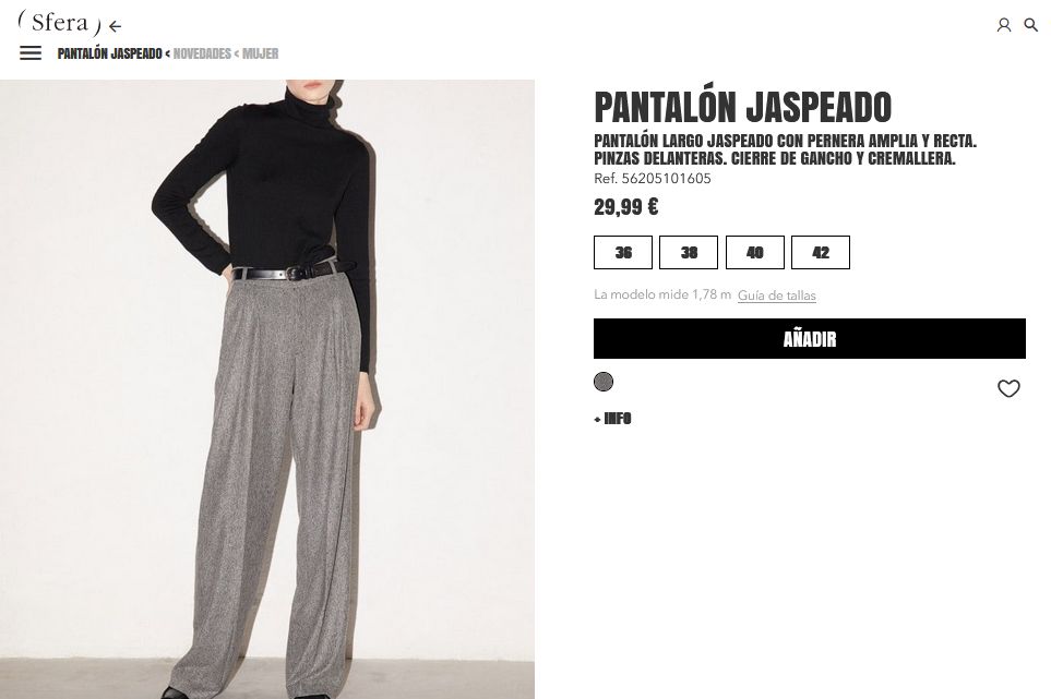 Es un cómodo pantalón largo jaspeado que ofrece una comodidad increíble en la mujer que lo use. Además, cuenta con una pernera amplia y recta, pinzas delanteras para generar un toque único en la prenda. Inclusive, posee un cierre de gancho y cremallera para que lo puedan sujetar; se puede usar con una hermosa camiseta de la misma tienda. Si desean comprar esta prenda solo tienen que entrar a Sfera por un precio de 29,99 €.
