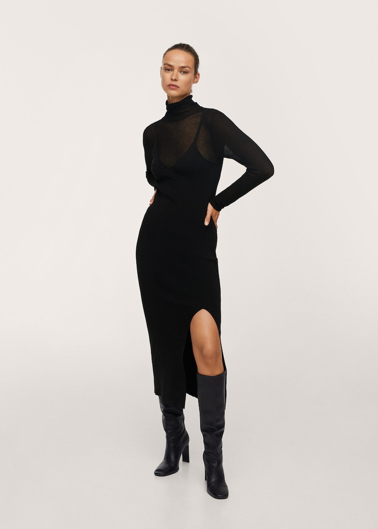 El vestido negro es un clásico en el fondo de armario femenino. Si todavía no tienes uno, quizá esta opción de Mango te ayude a suplir esa carencia. Un diseño elegante y original que combina el tejido de punto con las transparencias.