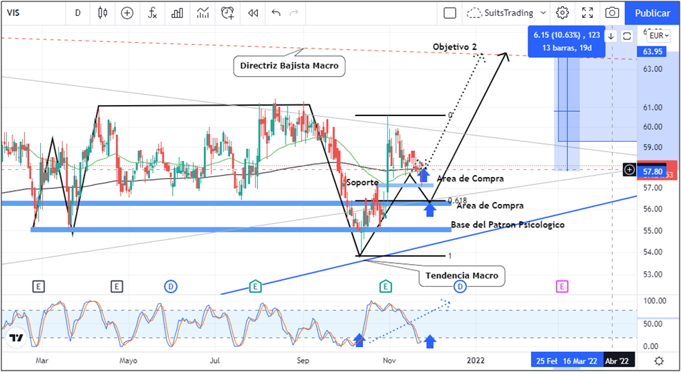 El pasado 19 de octubre compartíamos a través de nuestra webinversión.es, un análisis técnico el cual incluye un patrón psicológico que se conjuga con el movimiento alcista de mediano plazo.Comentamos unárea de compra con posibilidad de adherir, la cual en este momento presenta la gran oportunidadya que el precio se encuentra trabajando sobre el último soporte del 22 de octubrearriba de los 57,1 euros. Al mismo tiempo trabaja sobre las medias móviles exponenciales de 50 y de 250 periodos y adicional, el índice de fuerza relativa se encuentra en niveles extremos de sobreventa.De esta forma, sin duda alguna, son confirmaciones de compra para buscar como primer objetivo los máximos de agosto de 2021 arriba de los 61 euros por acción y como segundo objetivo la directriz bajista macro mensual cercana a los 64 euros por acción.