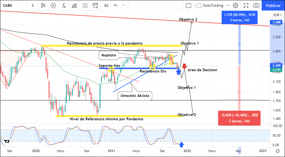 Pero cuidado, si el precio de la acción de Caixabank realiza el quiebre del soporte clave de enero de 2021, es decir, realiza la ruptura a la baja de los 2,35 euros, tiene una alta probabilidad que ante un primer pullback bajo el mismo nivel que se coloca como resistencia del 19 de julio, lastre la acción de Caixabank a niveles críticos. Un primer objetivo se ubica en niveles de 1,93 euros correspondiente a los mínimos de enero de 2021 y muy seguramente buscaría como segundo objetivo los mínimos creados por la pandemia en niveles de 1,5 euros por acción.