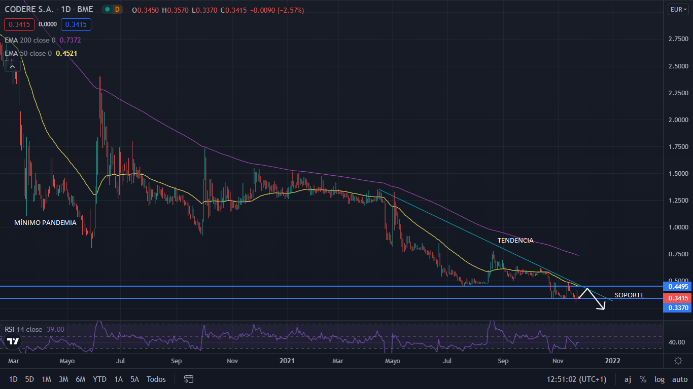 A nivel técnico, sin demasiadas expectativas, Codere sigue inmerso en una constante caída desde su salida a cotización. Actualmente en el soporte de los 0,33 euros, su proyección para el cierre del año 2021, apunta a situarse en los 0,30 euros.