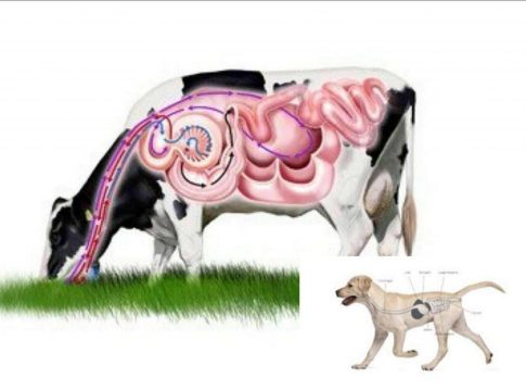 Puede parecer extraño, pero si se observa el aparato digestivo canino, desde la boca, cuya función es solamente cortar y tragar, hasta su limitado estómago y reducido sistema de glándulas, necesita que alguien acondicione los alimentos antes de consumirlos. Entonces, ¿Quién procesa los alimentos que comen los perros? Las presas. Son ellas las que tiene una boca con movimiento lateral y muelas con meseta para formar bolo alimenticio. Tienen cuatro estómagos para distintos procesos de los nutrientes. Pueden cortar con la amilasa y otras enzimas las cadenas largas de polisacáridos y convertirlas en azúcares simples. Es por eso que para todos los que piensan que los perros comen comida natural como carne, huesos y verduras cortadas y ralladas, pueden resultar sorprendentes varios aspectos. Para empezar, las verduras que su dueño corta y ralla con tanto trabajo, irán a las deposiciones sin poder asimilarse. Además, la carne podrá ser asimilada, pero no tiene todo lo que el perro necesita, por lo que es normal verle comer desesperado los excrementos de caballos o vacas cuando se pasea por el campo, es decir que el perro está buscando allí, en esos excrementos, los nutrientes que la presa hubiera procesado con su aparato digestivo. Por último, los huesos desgastarán o incluso romperán prematuramente los dientes, y además podrán acumularse en su aparato digestivo hasta causar graves lesiones o incluso la muerte.