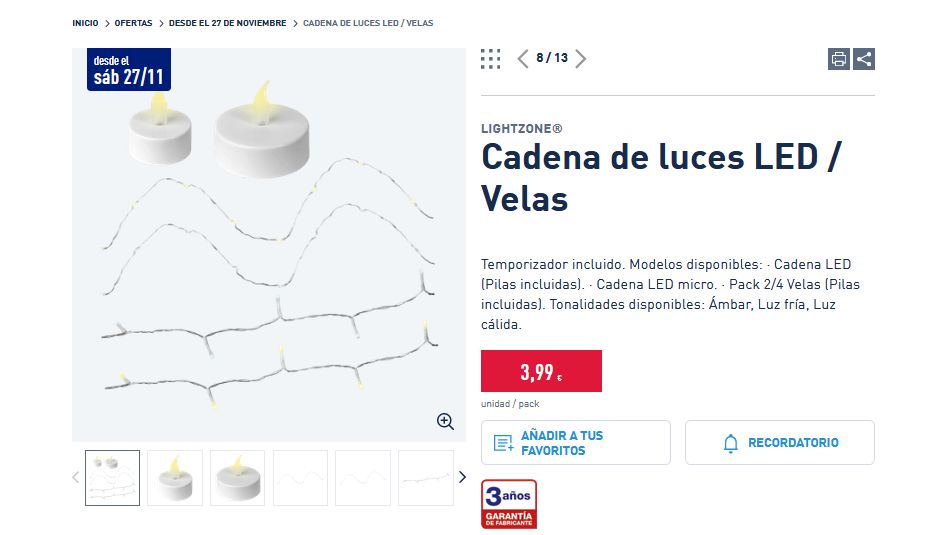 Es otra de las cadenas de luces LED/ Velas que cuenta con un temporizador incluido. Además, la pueden obtener en modelos disponibles, como cadena LED (Pilas incluidas). Inclusive, cadena LED micro, pack 2/4 Velas (Pilas incluidas). Está disponible en las tonalidades como en ámbar, luz fría, luz cálida. Entonces, si desean comprar estas hermosas velas aromáticas solo tienen que entrar a Aldi por un precio de 3,99 €.