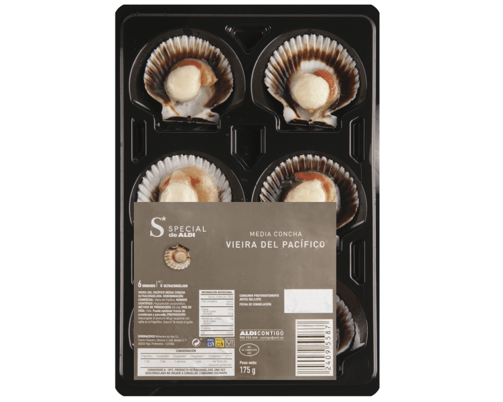 Es esta bandeja de vieiras del Pacífico que vienen abiertas con media concha. La bandeja tiene 175 gramos del producto, 6 conchas, y las podrás preparar como más te gusten…