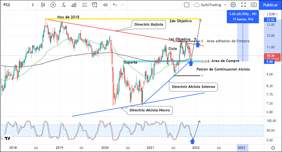 Adicional a ello, FCC registró una reducción del 13,6% de deuda financiera por venta de activos y una mayor generación de caja operativa lo que en cierto modo le permitió eliminar créditos de línea factoring. Con estos buenos resultados la compañía se pone por encima de los presentados en 2020 pero al mismo tiempo de los resultados previos a la pandemia. Sin embargo, el precio de la acción no ha tenido el impulso necesario para trabajar en los niveles previos a la pandemia arriba de los 11,8 euros por acción. La razón, desde el punto de vista técnico, la encontramos en varios aspectos.
