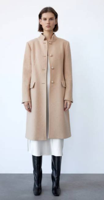 Esta de Zara es una de las más bonitas que hemos encontrado. Es un abrigo de cuello subido con hombros marcados y bolsillos delanteros rematados con solapa. Con cierre frontal con botones dorados y de corte entallado en la cintura.