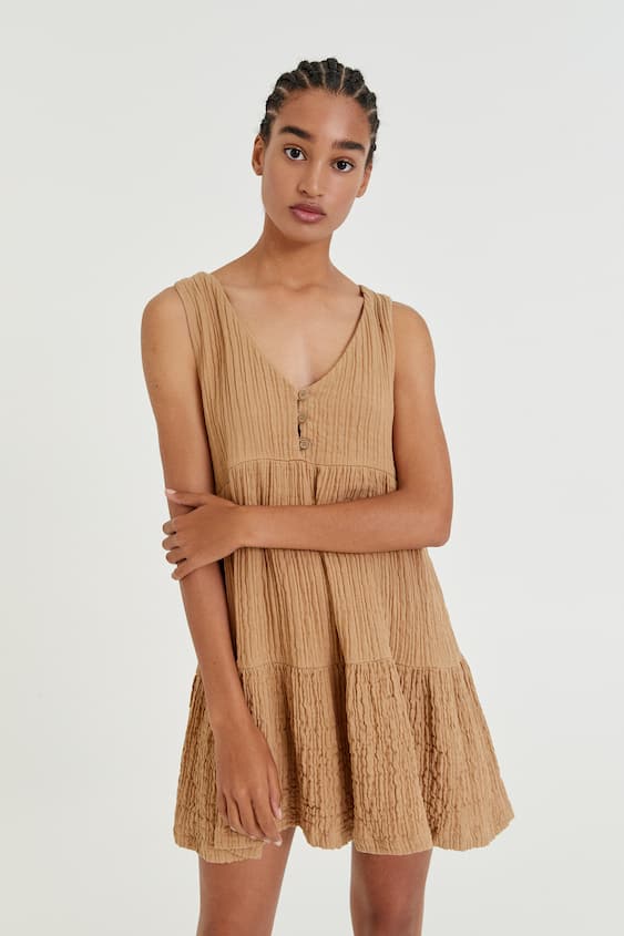 Con sus mangas sisa, puedes destacar tu torso, su cuello pico dejara que luzcas un delicado collar y tus preciosos pendientes. Prepárate para la primavera con este delicado vestido, lúcelo en dos colores, arena y rosa. Puedes llevarlo por solo 25.99 euros.