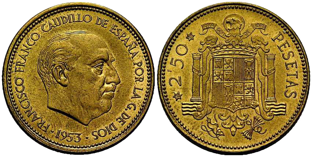 En el año 1953 se fabricaría la moneda de 2.5 pesetas, sí 2.5, aunque parezca extraño así fue. Esta moneda es muy difícil de encontrar, por lo que los coleccionistas pagan aún más.