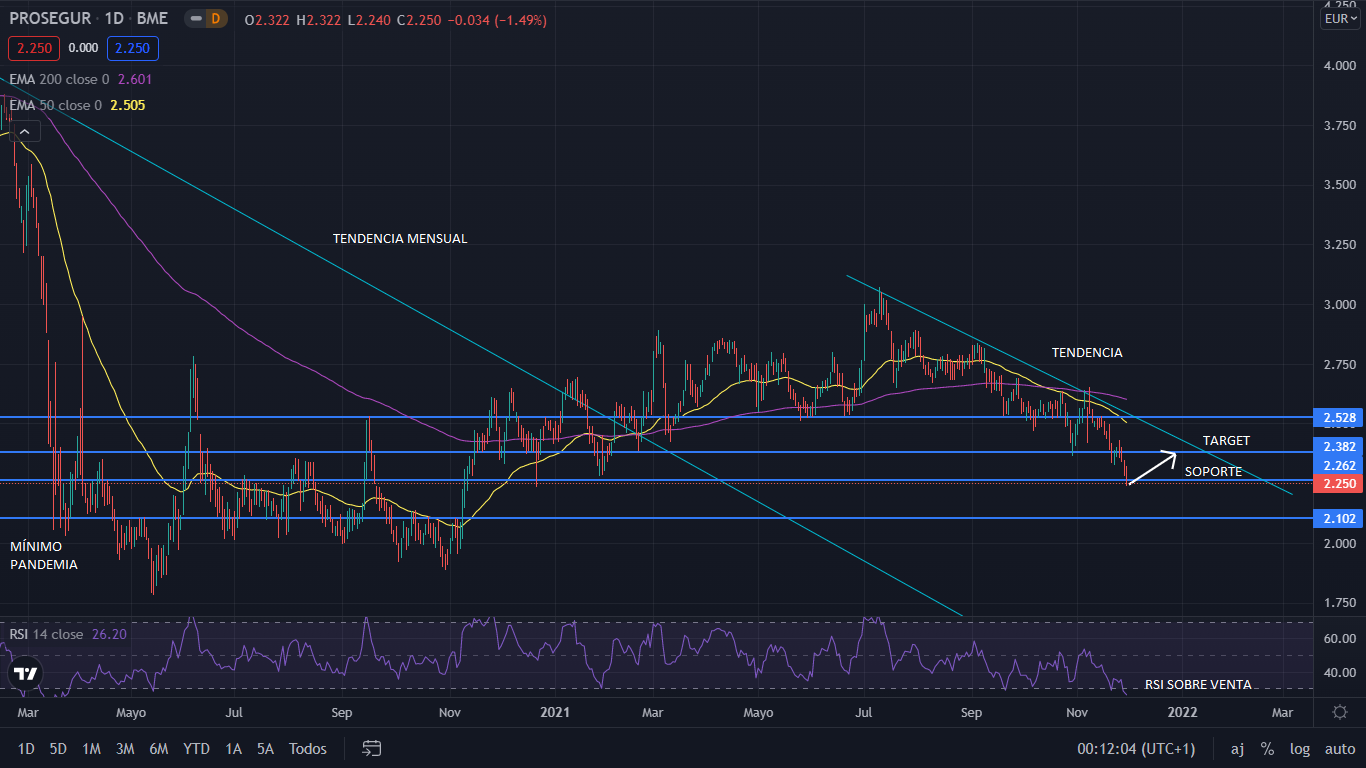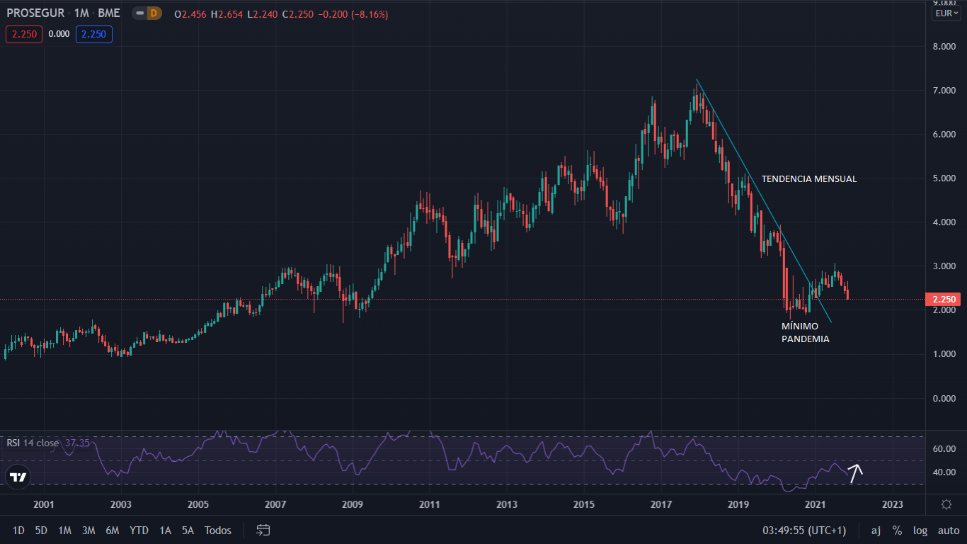 A nivel técnico, Prosegur en grafico mensual trae una tendencia bajita desde su máximo histórico alcanzado en 2018. Si tomamos el precio actual como una corrección, el precio en el largo plazo continuará alcista, situándose sobre los 3 euros para 2022.