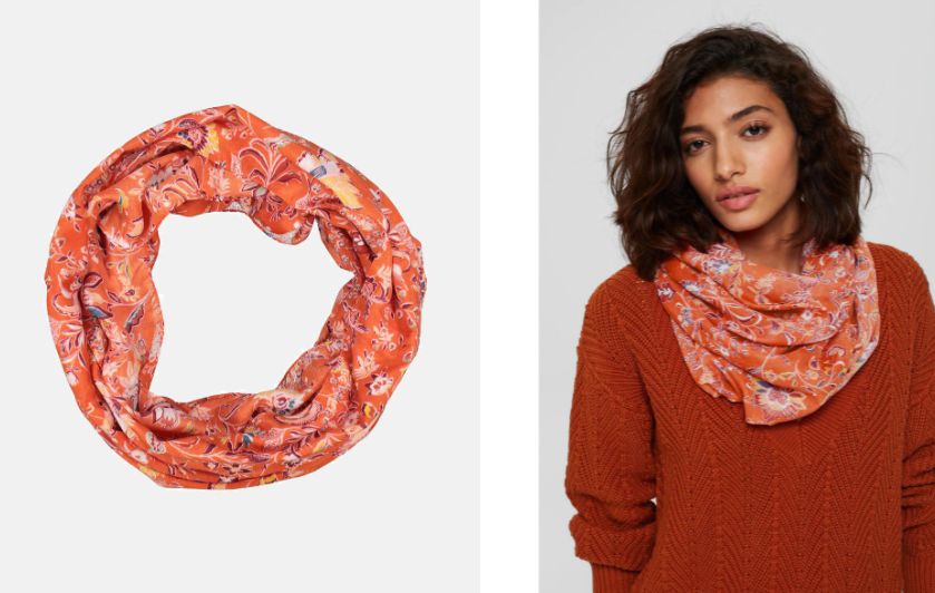 Seguimos con complementos para el cuello y cuidado de la garganta con un elemento que está de moda y muchos lo prefieren a la bufanda. Hablamos de cuello, que ya viene cerrado y solo hay que bajárselo hasta el cuello. Este que te mostramos, también de Esprit, es de un diseño y colorido totalmente diferente al anterior, pensado para ir más informal y combinar con colores vivos. Lleva un estampado paisley precioso y lo tienes aquí por 19,99 euros.