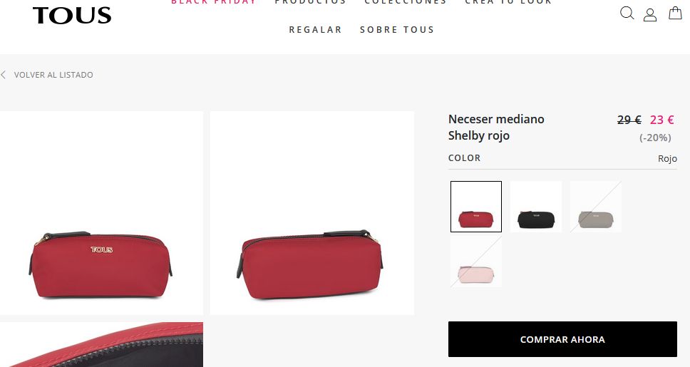 Neceser es uno de los chollos preferidos de las mujeres, ya que este es completamente mediano de la colección Shelby de nylon en color rojo. Además, posee un cierre con cremallera para que las mujeres puedan guardar sus cosas. Inclusive, cuenta con unas medidas perfectas: 17 x 8 x 7 cm, para que se puedan usar en todo momento. Entonces, si lo desean comprar solo tienen que entrar a Tous por un precio de 23 €.