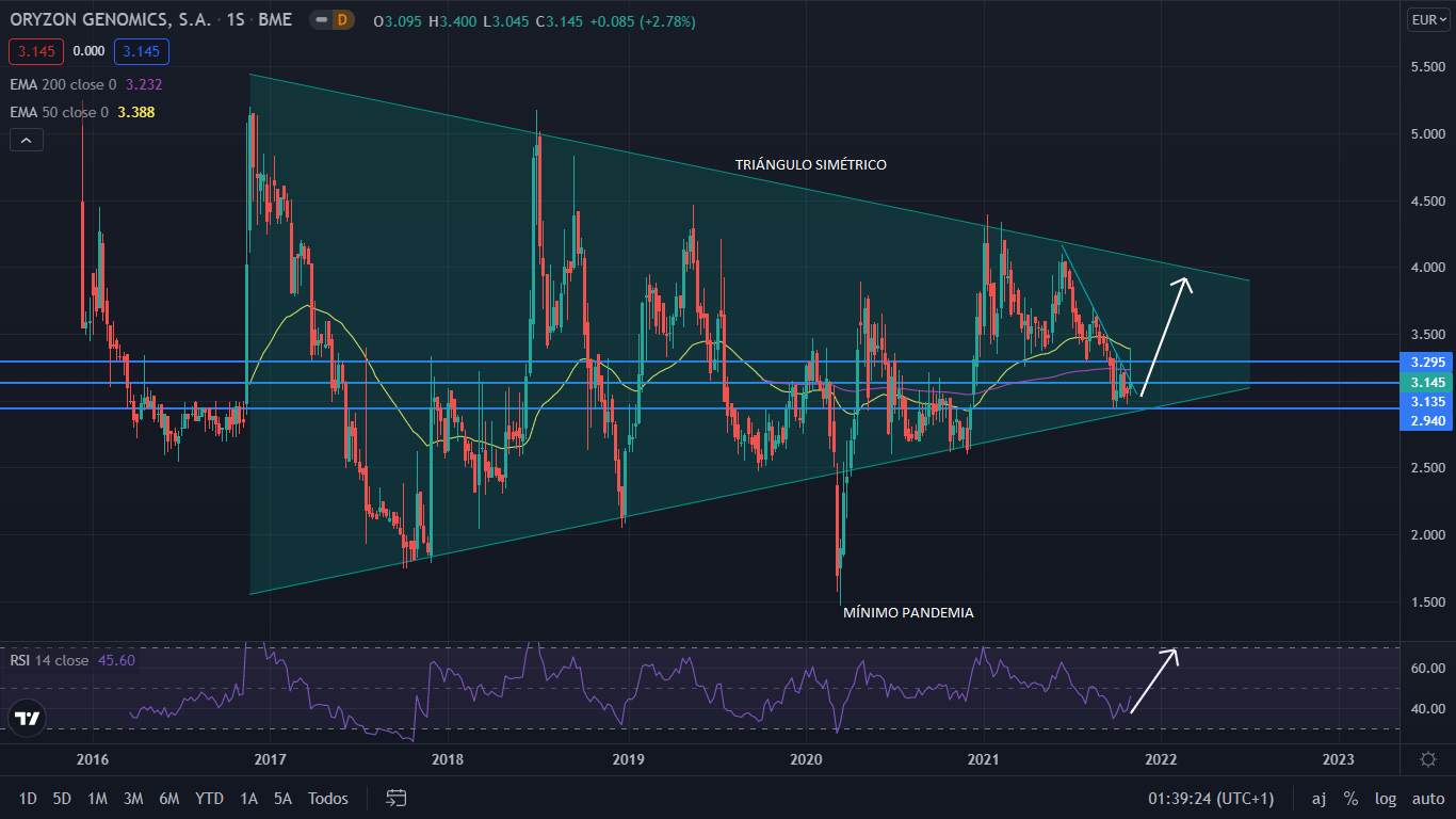 A nivel técnico, en gráfico semanal Oryzon trae un triángulo simétrico desde el año 2017. Con esta estructura en el precio, su proyección para principios de 2022 lo sitúa en los 4 euros, parte alta del triángulo.