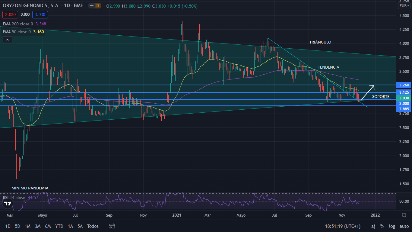 En grafico, diario Oryzon se sitúa en una estructura lateral entre los 3,03 y 3,26 euros. El precio se encuentra prácticamente en la parte baja del triángulo. De continuar con la estructura, para el corto plazo precio saldrá a alcista, para situarse en los 3,26 euros para el cierre del 2021. Si Oryzon pierde el triángulo, el precio iría bajista perdiendo los 3 euros en el corto plazo.