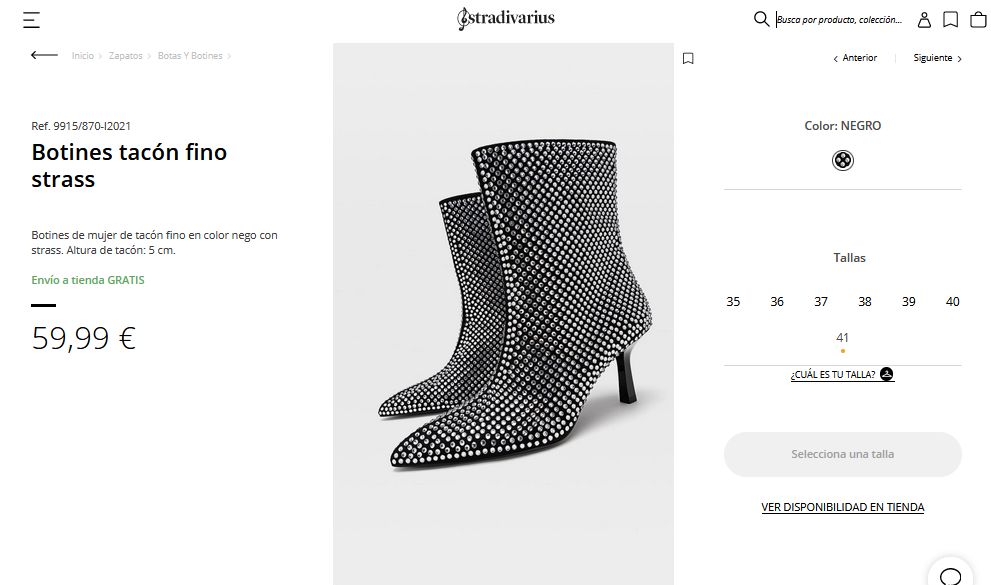 Es otro de los grandes botines preferidos en esta temporada, dado que cuenta con un increíble estilo para una mujer elegante. Además, cuenta con un tacón fino en color negro con strass y tiene una altura de 5 cm. Por lo que, son perfectos para generar elegancia en todo momento. Entonces, si desean comprar estos botines de tacón tienen que entrar a Stradivarius por un precio de 59,99 €.