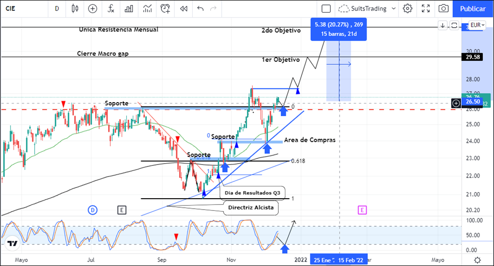 El pasado 12 de noviembre publicamos un artículo con objetivos claros a los 26,14 euros los cuales ya cumplió. Luego de ello, realizó un movimiento de retroceso que confluía con el soporte más cercano en inmediaciones de los 24 euros respetando la última directriz alcista de manera tal que permitiera nuevas entradas en compras. Actualmente el precio se encuentra trabajando sobre el soporte más cercano del 15 de julio al 16 de agosto en inmediaciones de los 25,9 euros por acción.
