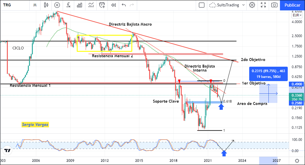 Posteriormente visitará como segundo objetivo el área de regularidad de mercado del cierre del ciclo macro que se encuentra en inmediaciones de los 1,10 euros por acción donde al mismo tiempo deberá luchar contra la directriz bajista macro para definir completamente una senda alcista y lograr nuevamente sus máximos históricos.
