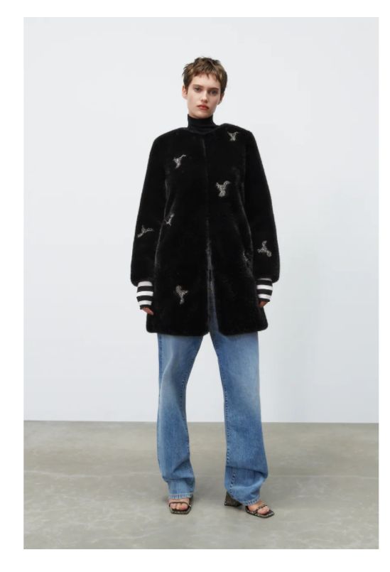 Vamos con un abrigo ideal para estas fechas navideñas, para lucir en las reuniones de estas fechas. Es un modelo con efecto pelo de cuello redondo y manga larga, bolsillos laterales y detalle de aplicación de joyas en contraste. El forro interior también está a tono y el cierre es frontal con ganchos ocultos. Lo tienes en Zara ahora en color negro y a un precio de 99,95 euros.
