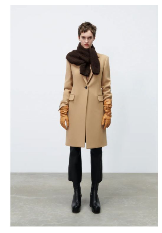 Vamos con un modelo de estilo más bien otoñal y perfecto para combinar con tus mejores galas en las comidas y cenas navideñas que se avecinan. Se trata de un abrigo de lana con estilo masculino y confeccionado en tejido con mezcla de lana. Es de cuello solapa y manga larga con hombreras. El bajo es con abertura en espalda y el cierre es frontal con botón. Se vende en Zara en color tostado claro por 99,95 euros.