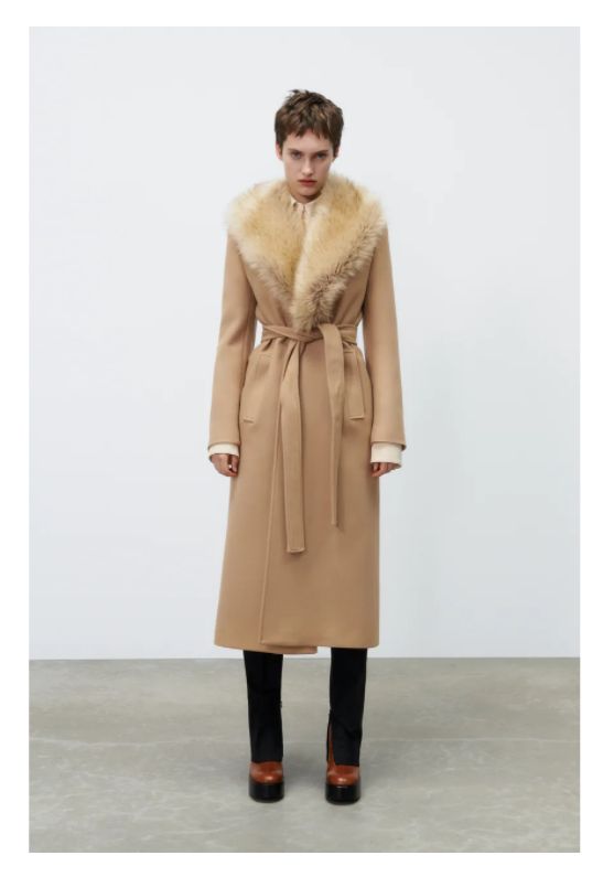 Vamos con un abrigo largo de lo más estilizado y una vez más confeccionado con tejido en mezcla de lana. Tiene un bonito cuello de solapa también con efecto pelo extraíble. El cinturón es de lazada con el mismo tejido. El bajo está acabado con abertura en la espalda y el forro interior está a tono. En Zara lo tienes en tostado claro por 129 euros.