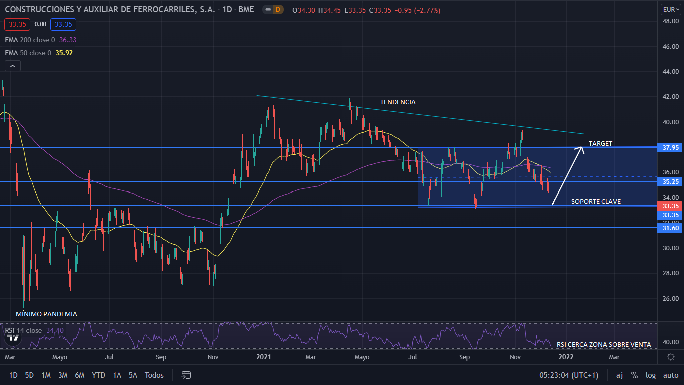 A nivel técnico, desde el mínimo marcado por la pandemia, CAF había casi recuperado su nivel prepandemia en enero de 2021. Desde dicho punto su precio ha sido bajista el resto de este año. Actualmente el precio se sitúa en el soporte fuerte de los 33,35 euros. CAF podría estar dando pie a una formación de canal lateral. De no perder dicho soporte, el precio ira alcista nuevamente hasta la parte alta de dicho canal, situado en los 37,39 euros. Movimiento que nos daría un 14%.