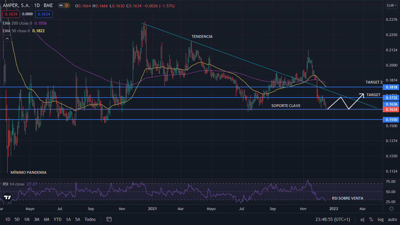 A nivel técnico, desde el mínimo de marzo de 2020, su precio creció un 112%, alanzando los 0,23 euros. Tras alcanzar dicho nivel, Amper ha sido bajista todo este año, perdiendo un 30%, soportado en los 0,16 euros. Para el corto plazo, con el precio en dicho soporte y con el RSI en sobre venta, su proyección es alcista. De cerrar el ejercicio 2021 con buenos resultados, el precio saldrá de la tendencia bajista, para ir a buscar los 0,18 euros. Actualmente Amper se sitúa aun 74% de su nivel anterior a la pandemia.