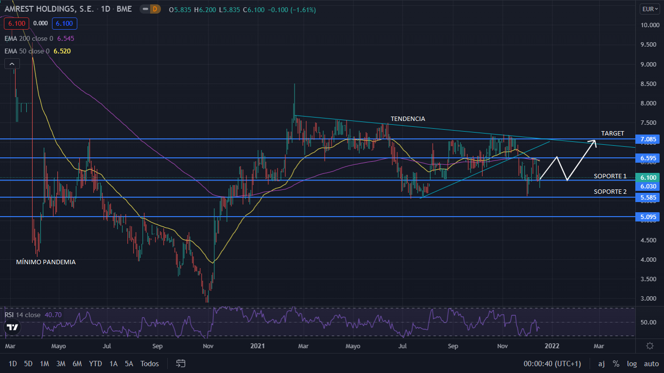 A nivel técnico, desde el mínimo de noviembre de 2020, su precio ha crecido un 190%. Tras dicho máximo, su precio ha ido cayendo poco a poco durante este año. AmRest se encuentra en una especie de canal lateral, entre los 7,00 y 5,58 euros. De obtener un cierre del ejercicio 2021 positivo, su precio en primera instancia podría salir de la estructura actual, superando los 7 euros en el primer trimestre de 2022. Movimiento que nos dejaría un 20%.