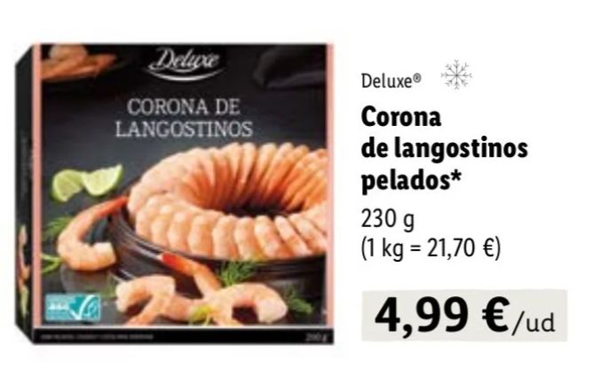 Si la carne es un reclamo, no digamos nada el marisco. Al menos en Navidad no puede faltar. Pero si no quieres gastarte mucho, opta por el más económico, la gamba, aunque en Lidl tienes una variedad inmensa a los mejores precios. La cadena alemana incluyó en el catálogo de ofertas esta corona de langostinos pelados para causar sensación en la mesa. Son 230 gramos de producto por 4,99 euros.
