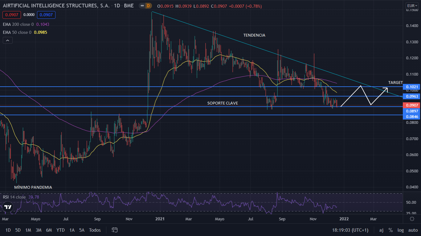 A nivel técnico, desde le mínimo de marzo de 2020, Airtificial inició una tendencia alcista. En noviembre del mismo año rompía a alcista con una subida del 93%. Tras dicha subida, el precio paso a una tendencia bajista, con los 0,090 euros como soporte clave. Actualmente el precio se sitúa en dicho soporte, por lo que, en primera instancia el precio irá alcista a la línea de tendencia. De cerrar el ejercicio 2021 con buenos resultados, y de continua al ritmo de recuperación de la pandemia, el precio saldrá de la tendencia bajista a lo largo del primer trimestre de 2022.