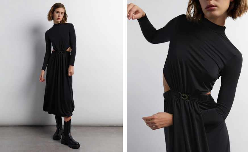 Nuestra última propuesta en vestidos largos es esta más transgresora y juvenil, que conviene tener en el armario prendas de todos los estilos, sin encasillarse. Por qué no lucir este vestido cut out de Sfera en estas navidades. Tiene cuello alto con abertura en la baja espalda, formando un diseño original y sexy. El negro siempre es tendencia y es otro color habitual para lucir en Navidad. Lo tienes en El Corte Inglés aquí por 35,99 euros.