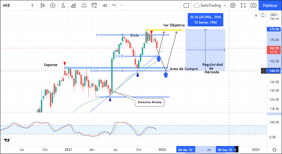 Técnicamente todo apunta a continuaciones alcistas del precio de la acción que desde abril de 2020 estructura la directriz alcista la cual, de visitar nuevamente y respetar, indicaría oportunidad de compra. No obstante, un mejor precio de compra institucional oscila en los 144 dólares donde confluye el área de regularidad en 61,8 de retroceso de Fibonacci con el siguiente nivel de soporte macro que se configura desde el 21 de diciembre de 2020 hasta el 18 de marzo de 2021. Este movimiento estaría apoyado del índice de fuerza relativa que se encuentra en niveles extremos de sobreventa. No obstante, de perder dicho nivel de soporte, el precio podría lastrarse inicialmente hasta los 125 dólares por acción con lo cual, de seguro, representará una nueva oportunidad al alza.
