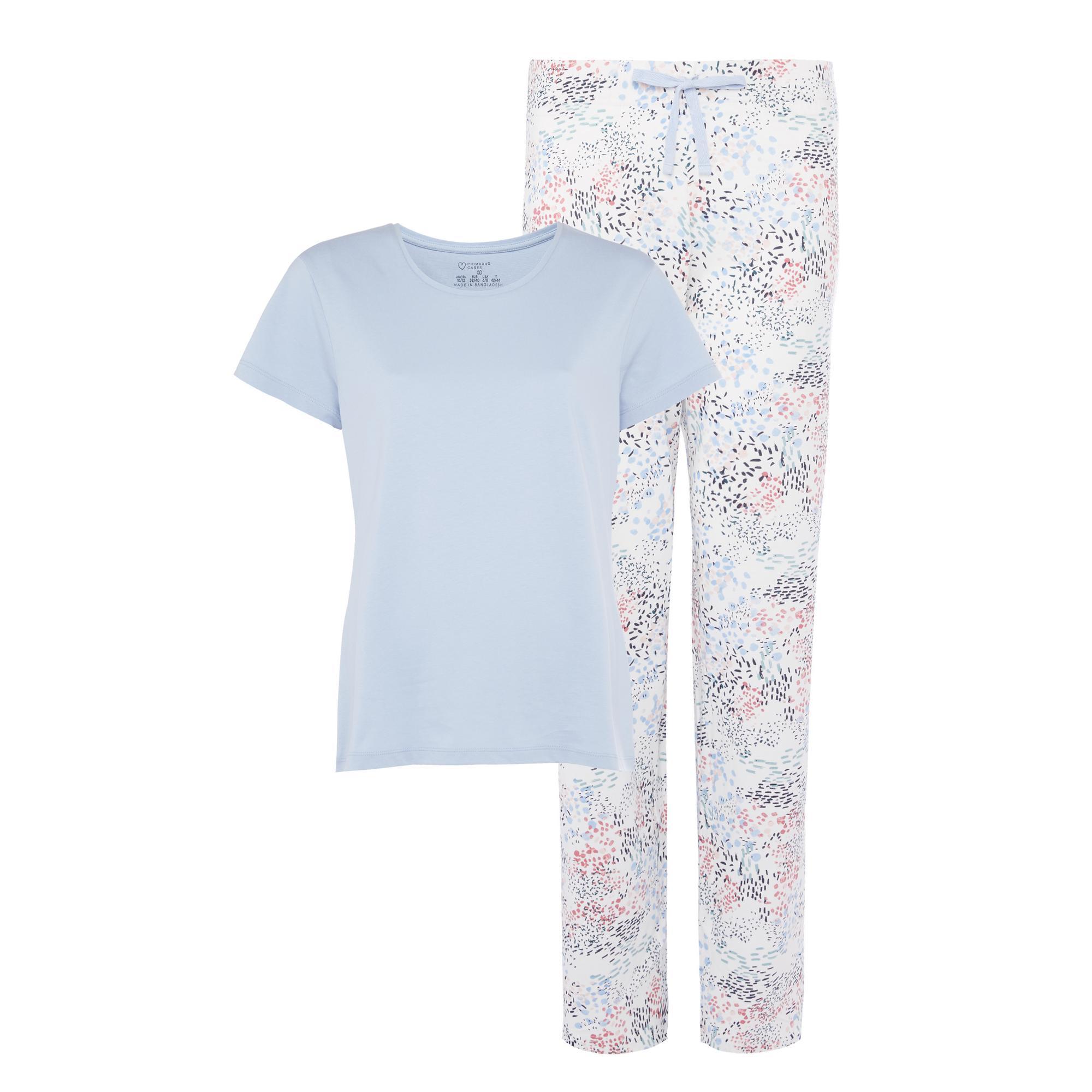 En Primark saben que no todos somos iguales y que no todo el mundo busca pijamas gruesos. Si eres una persona calurosa, o pones tanta ropa en la cama que lo que menos necesitas en una prenda que te haga pasar más calor, dormirás genial con este bonito pijama de color azul pálido con pantalón en blanco con tonos azules y rosas.