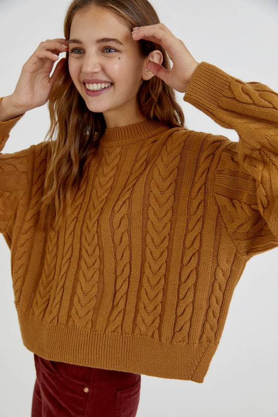 Diseñado con mangas largas, cuello redondo y punto de ochos. Te dará algo de abrigo, su tejido es un poco grueso y su cuello redondo algo ajustado. Búscalo en su delicado color Camello y su precio es de 22.99 euros.