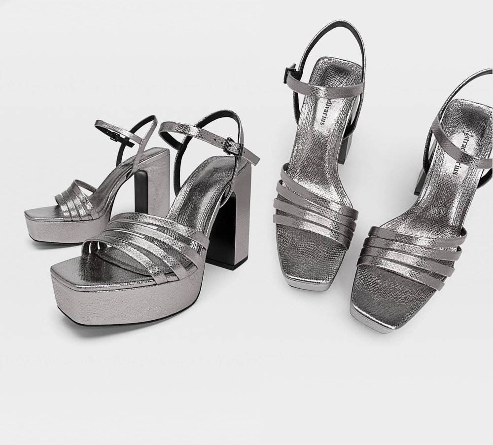 Por último, también están disponibles estas sandalias de tacón con plataforma, para realzar tu estatura. Stradivarius las tiene por 35,99€. Disponible en varias tallas y en tono plomo metálico.