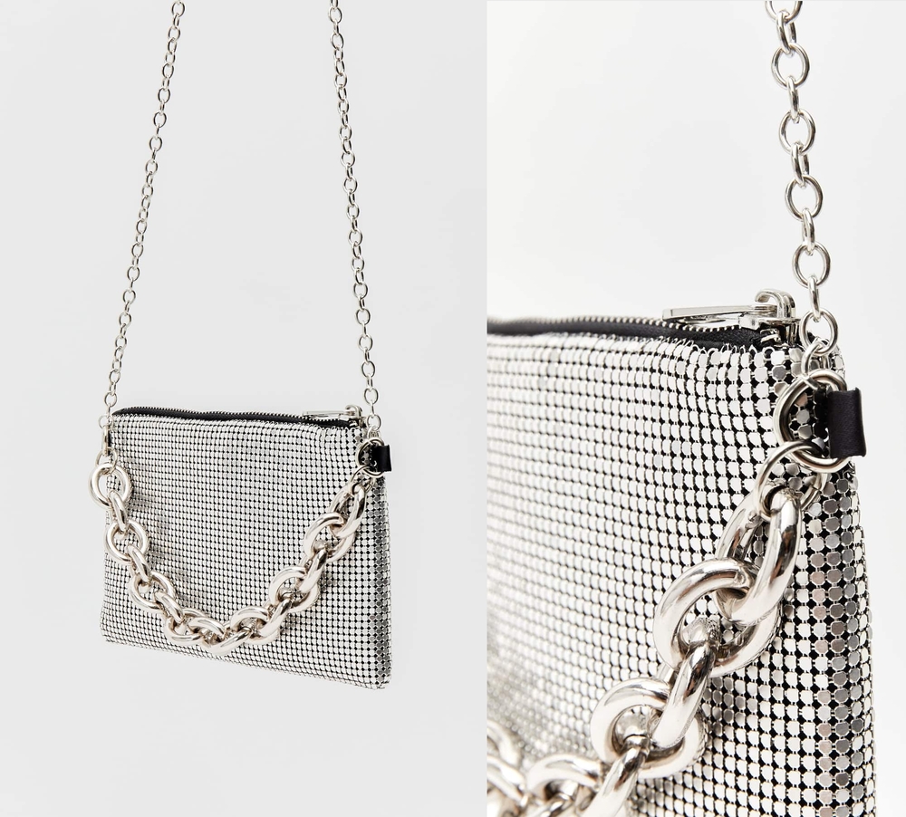 No todo son vestidos, Stradivarius también tiene complementos, como esta mini bandolera de malla brillante que va perfecta con muchos de estos diseños. Su precio es de 15,99€, con talla única y un solo acabado.