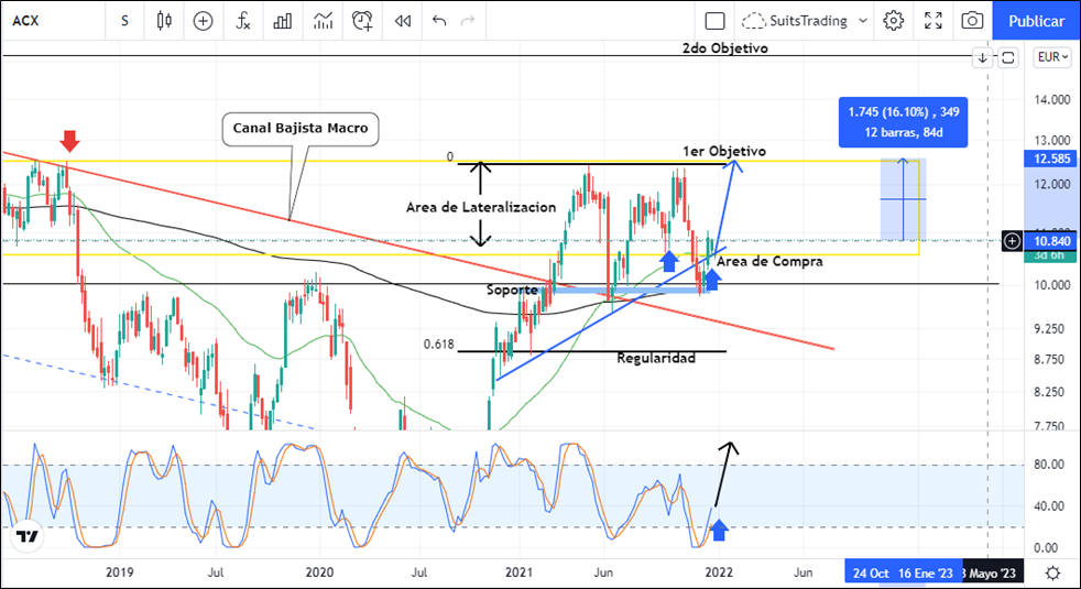 El gráfico de marco diario muestra la recuperación del área de lateralización macro que el precio ha venido trabajando desde el año 2017. Área que se encuentra entre los 10,8 euros hasta los 12,4. Por lo tanto, una vez el precio recupera el nivel inferior, podrá ejercer presión alcista. Al mismo tiempo se ubica nuevamente sobre la directriz alcista que se viene construyendo desde finales de 2020 trabajando por encima de la media móvil exponencial de 250 periodos de marco diario y sobre la media móvil exponencial de 50 periodos de marco semanal.