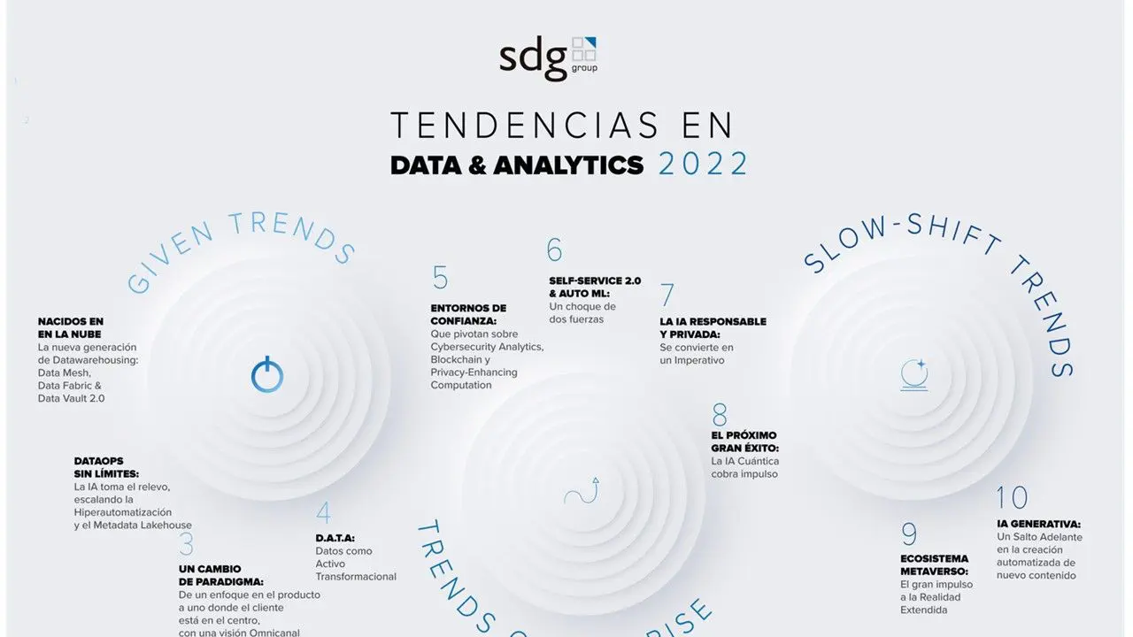 En el último año tanto las empresas como las personas han tenido que ser resilientes para adaptarse a la nueva normalidad. La tecnología y, en concreto, el análisis de datos se han convertido en grandes aliados para encarar los retos empresariales, sociales y, también, culturales que la pandemia ha supuesto. Tanto es así que, según la Guía mundial de gastos de Big Data y análisis de IDC, el gasto europeo en soluciones de Big Data y análisis de negocios (BDA) alcanzará este año los 50.000 millones de dólares, un 7% más con respecto a 2020. Además, se calcula que en 2025 habrá 25.000 millones de dispositivos conectados que compartirán información gracias a la inteligencia artificial, lo que supondrá un ingente incremento del volumen de datos a analizar a disposición. SDG Group da a conocer las nuevas tendencias de Data Analytics para el 2022 desglosando el ranking en Given Trends, las tendencias que ya están tomando el relevo; Trends on the Rise, es decir aquellas tendencias emergentes que tendrán un impacto significativo en el medio plazo y, por último, Slow-Shift Trend, el grupo de tendencias que se vislumbra en el horizonte y entrarán en el juego gradualmente.