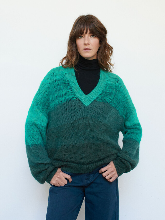 Este que te mostramos en un jersey con cuello de pico que combina diferentes tonos de verde de arriba hacia abajo, empezando por los más claros y llegando hasta las tonalidades más oscuras.