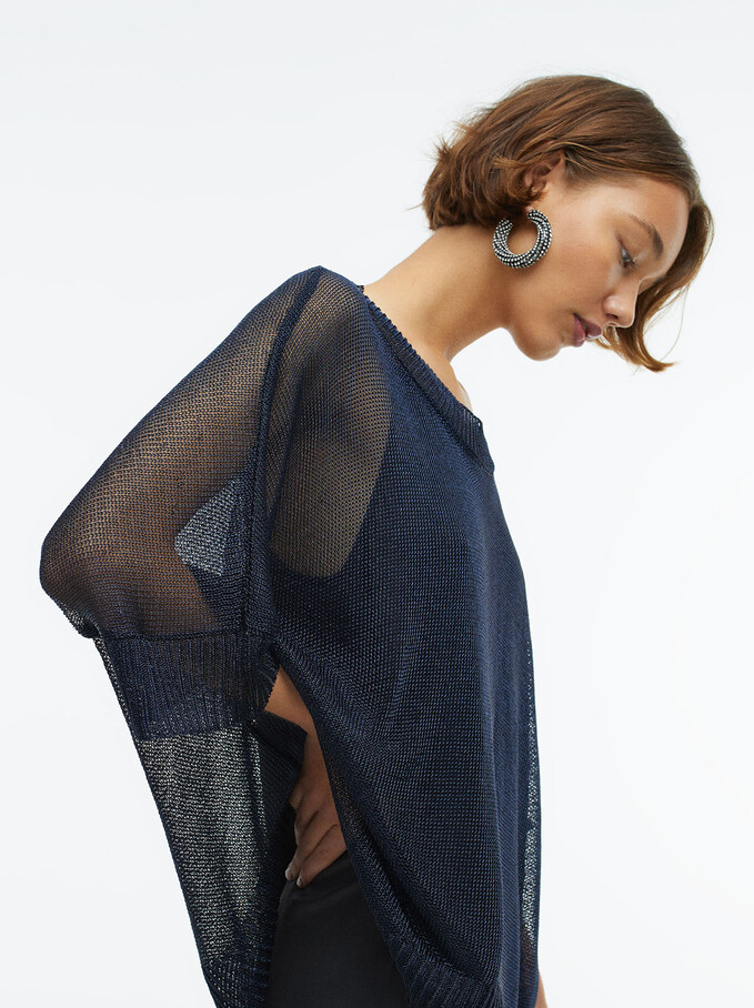 Esta es la apuesta de la firma para cuando quieres ir guapa y abrigada. Se trata de un jersey de punto semitransparente con manga francesa. Es de talla única y permite crear diferentes siluetas según lo lleves por fuera o por dentro.