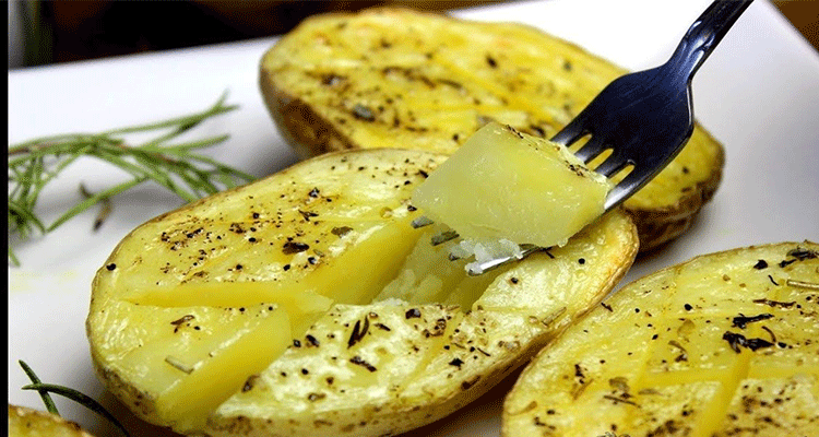 Después nos ponemos con las patatas que servirán de guarnición para el entrecot. Las lavamos, las cortamos por la mitad y les hacemos unos cortes en cruz en la parte interior con ayuda de una puntilla para que se cocinen más fácilmente. Las ponemos en la fuente de horno que hemos cubierto con las especias con la parte de la piel hacia arriba. Las regamos con un chorro de aceite de oliva y las horneamos, después de haber precalentado el horno, durante unos 35-40 minutos a unos 180ºC.