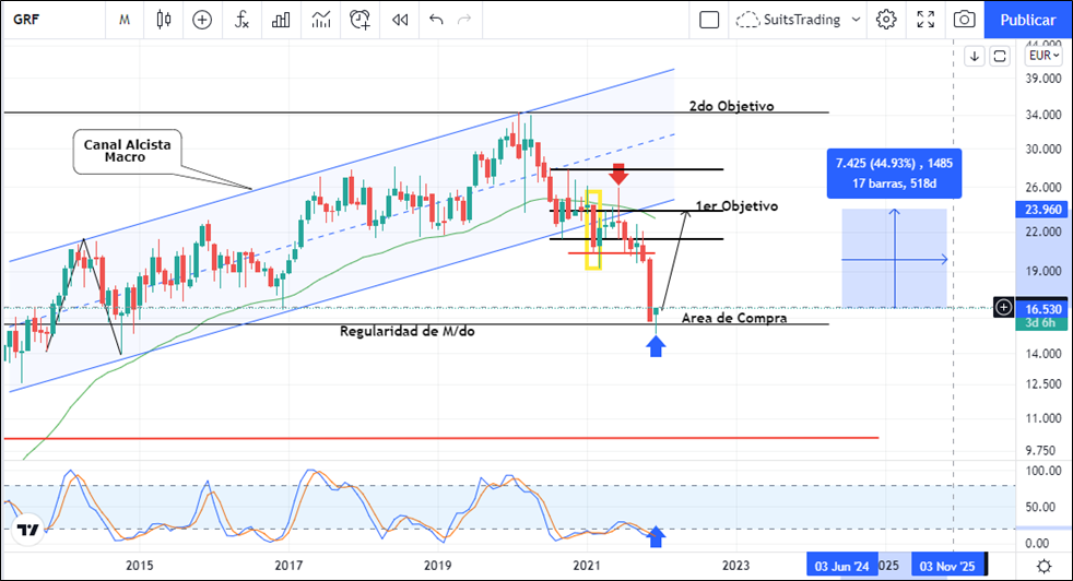 Aunque fundamentalmente Grifols viene trabajando en contra de su alto nivel de apalancamiento con lo cual disminuye la capacidad de flujo de efectivo y que atada a una deficiencia en la recolección de plasma por culpa de las restricciones creadas para hacer frente a la pandemia e inclusive, por sus decisiones frente a la adquisición de Biotest, desde el punto de vista técnico, la acción de Grifols tenía una muy alta probabilidad de buscar la regularidad del mercado que se presenta siempre que un activo financiero ha desarrollado un claro avance al alza como sucedió con la acción de Grifols, la cual desde enero de 2010 hasta los máximos históricos en febrero de 2020 previo a la pandemia, la acción se revalorizó cerca del 746%.