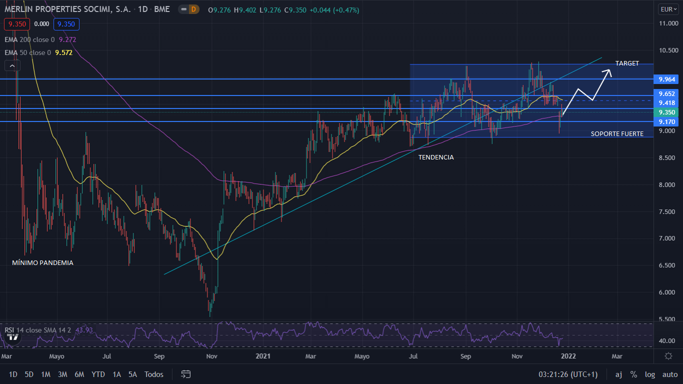 A nivel técnico, desde el mínimo marcado en noviembre de 2020, Merlin se ha apreciado un 70%, pero aún se sitúa a un 43% de su nivel anterior a la pandemia. Desde el pasado mes de agosto Merlin marcó un máximo postpandemia, que lo ha llevado a perder la tendencia alcista. Con el nivel de los 9 euros como soporte fuerte, el precio se ha establecido en una estructura lateral. Para el corto plazo, el precio irá de nuevo a la parte alta del canal, en los 10,25 euros. Con la publicación de los resultados del ejercicio 2021, veremos la dirección que tomaran las acciones de Merlin. Si sus resultados salen positivos mejorando los de los nueve meses, el precio podría supera los 10,25 euros, y continuar hacia su nivel prepandemia.