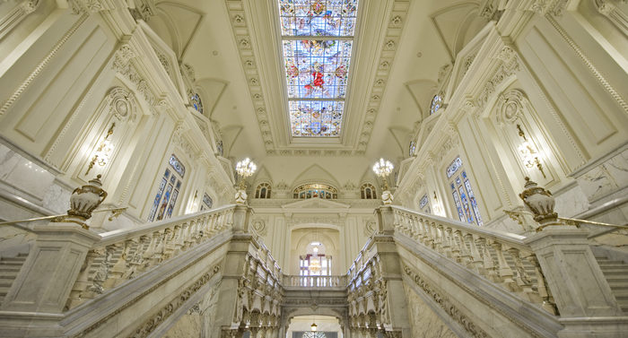 Bargueños italianos del siglo XVII, una araña de Baccarat, porcelana de Sèvres… por no hablar de las vidrieras. Las que integran la llamada Escalera Imperial (de mármol de Carrara) fueron realizadas por la prestigiosa Casa Mayer. ¿Su precio? 50.000 pesetas en 1890.