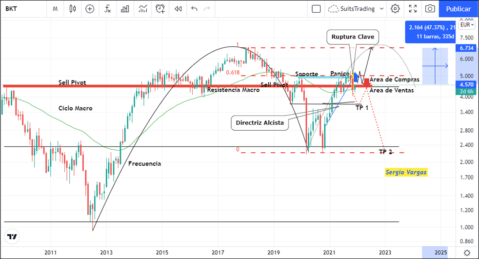 Por otro lado, si el precio realiza la apertura de gráfico de marco mensual en enero de 2022 por debajo de 4,3 euros, indicaría el probable desplome del precio en busca de los mínimos creados por la pandemia por debajo de los 2,3 euros por acción. Lo que paralelamente significa una desvalorización del precio equivalente a más del -40%.