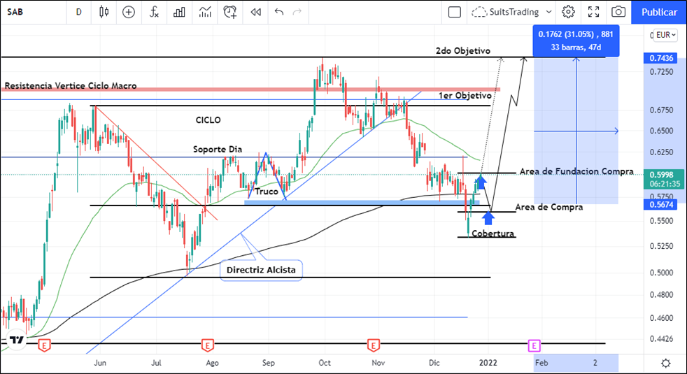 Técnicamente, debemos aprovechar la oportunidad que Banco Sabadell presenta para gráfico de marco diario, el precio ha desarrollado un cierre de ciclo que se estructura desde mayo de 2021 hasta septiembre dejando a su paso una formación de truco (V invertida) entre agosto y septiembre de 2021 con lo cual ha configurado un doble patrón alcista. Una vez el precio llega a regularidad del mercado que se calcula por la expansión del retroceso de Fibonacci del cierre de ciclo, el precio realiza una cobertura con lo cual quiebra y automáticamente recupera dicho nivel en inmediaciones de 0,56 euros. Esto permite vislumbrar un movimiento alcista el cual a cualquier retesteo sobre la media móvil exponencial de 250 periodos y sobre el último cálculo del retroceso de Fibonacci que visite y respete el nivel 61,8 de Fibonacci, indicará oportunidad de adhesión a las compras las cuales tendrán como primer objetivo el cierre del ciclo en inmediaciones de 0,68 euros para posteriormente buscar un segundo objetivo en los máximos de septiembre de 2021 arriba de los 0,74 euros por acción, operación que entregaría entre un 20% y 30% de beneficio en el corto plazo.