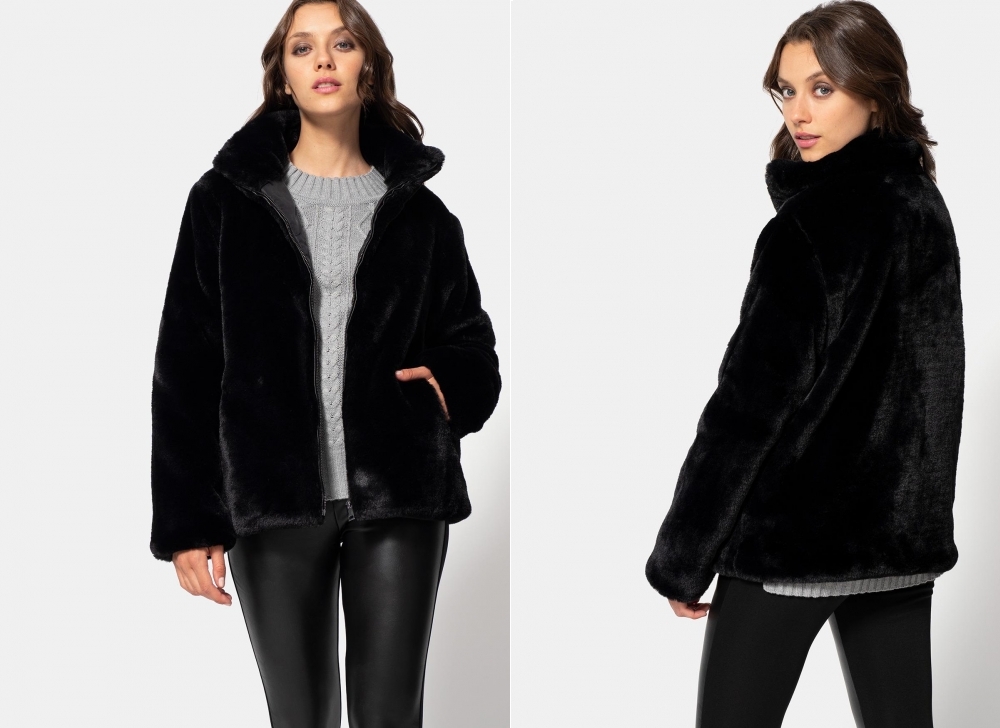 Confeccionado en fibras de poliéster al 100%, sin necesidad de emplear pieles animales. Un diseño con pelo corto, cierre con cremallera, y muy confortable y agradable al tacto.
