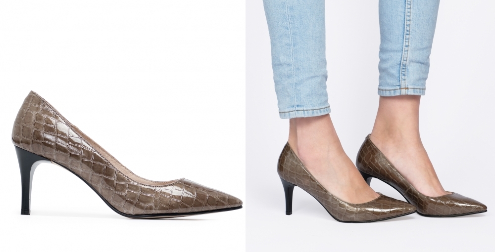 Este zapato está diseñado y fabricado en España, con un aspecto clásico en charol, grabado de coco, forro interior y plantilla, acabado en punta, y con tacón fino de 7 cm de altura. Para su elaboración se ha empleado polipiel para el exterior y piel flor porcina para el interior.
