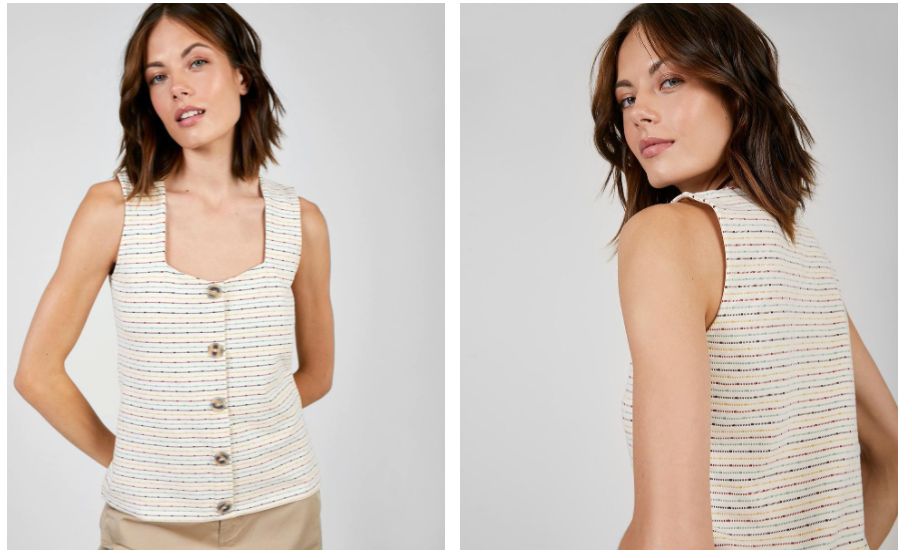 En este selección nos detenemos en todo tipo de prendas, para que tengas para cualquier ocasión y puedas renovar tu armario en todos los frentes. En este caso nos detenemos en otro imprescindible, el top. Lo hacemos en este con botones de Trucco que tiene un 56% de descuento y un precio de 12,99 euros. Se vende en color crudo y está fabricado en algodón en un 65%. En este enlace será tuyo.