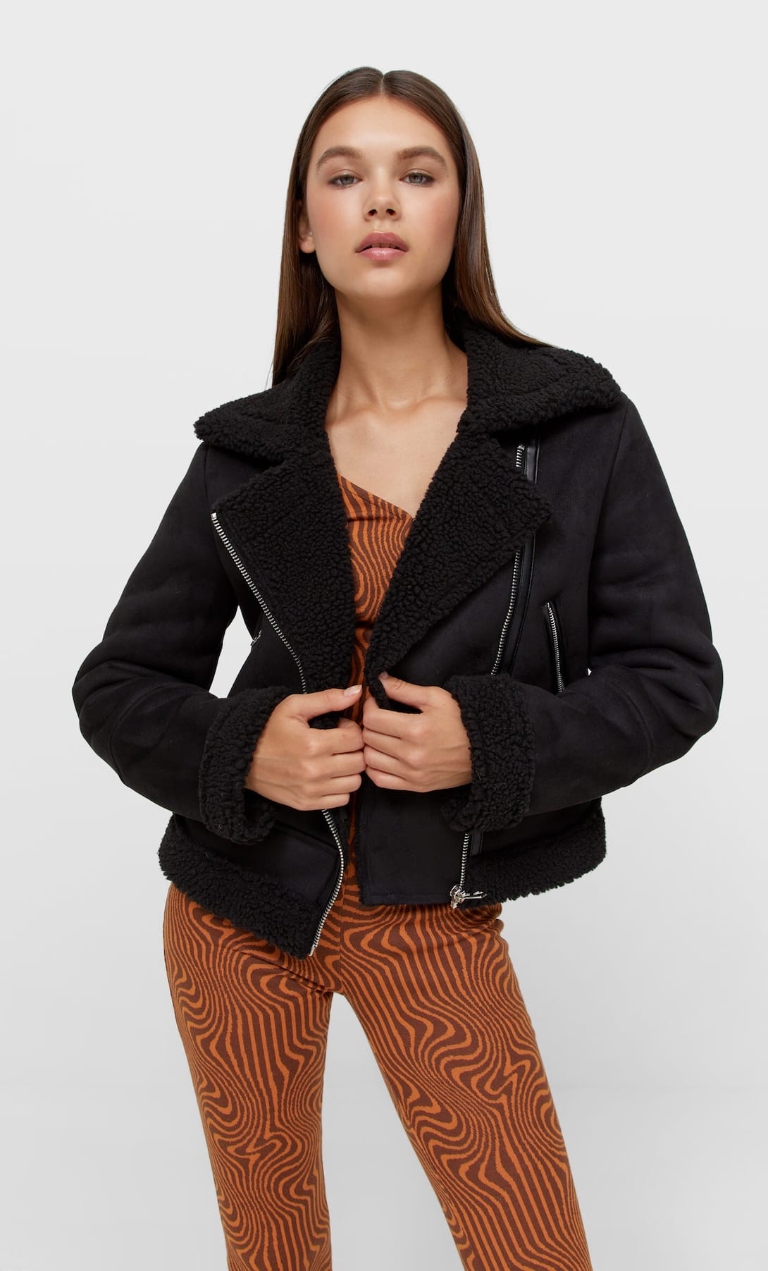 La cazadora biker es otro clásico entre las prendas de abrigo. Esta de doble faz tiene tejido de efecto ante por un lado y el interior es pelo de borreguito. Con manga acabada en vuelta. Disponible en negro y en crudo.