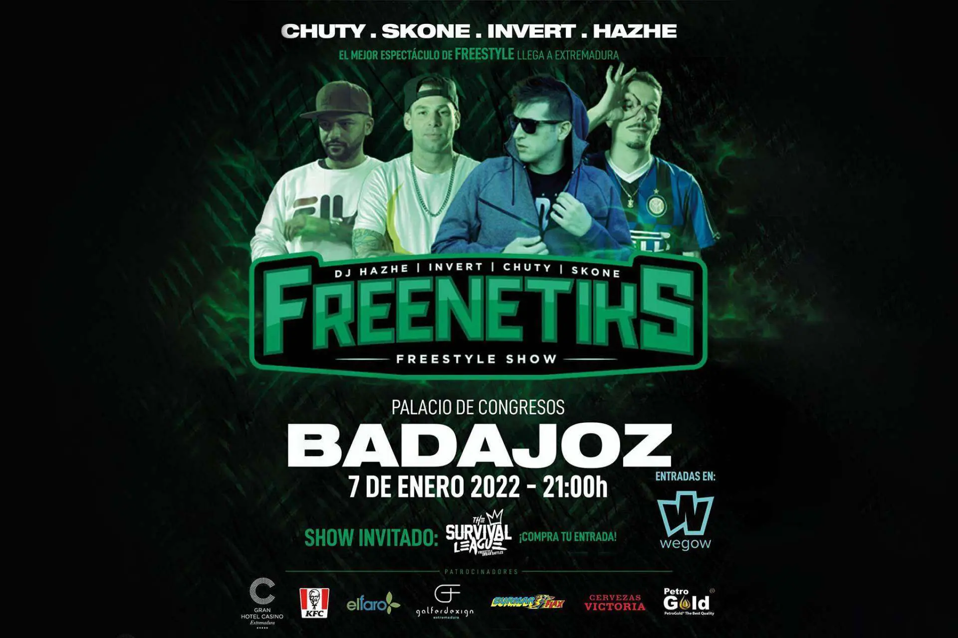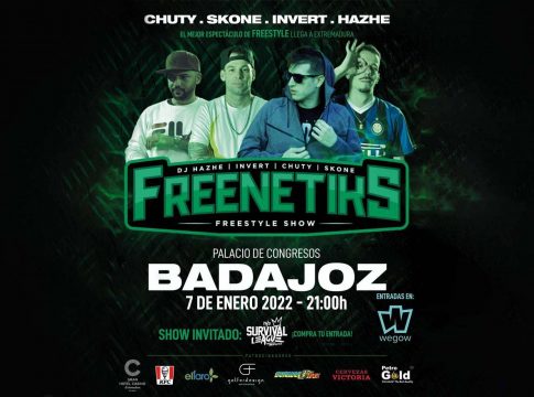 El Palacio de Congresos Manuel Rojas de Badajoz acogerá el próximo 7 de enero de 2022, a las 21 horas, uno de los mayores espectáculos de freestyle del país de la mano de Freenetiks, estrellas del circuito internacional del freestyle y las batallas de gallos.